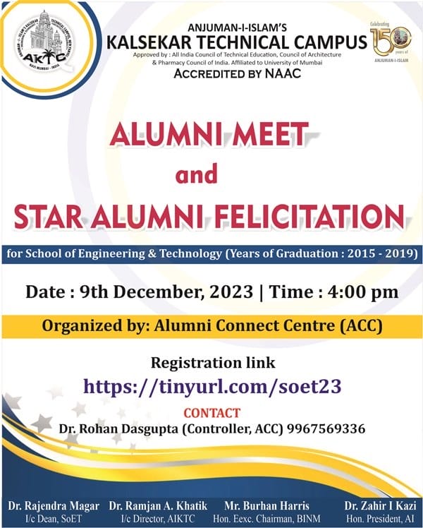 Alumni Connect Centre (ACC) of Anjuman-I-Islam's Kalsekar Technical Campus (AIKTC) is organizing an Alumni Meet and Star Alumni Felicitation for the alumni of School of Engineering and Technology (SoET) of years of graduation 2015 to 2019.