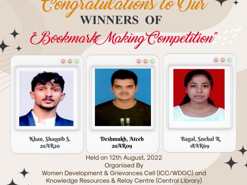 On the occasion of Librarians’ Day and Independence Day being celebrated nationally on 12th & 15th August 2022 respectively, Women Development & Grievance Cell (WDGC) in collaboration of Central Library organized series of activities from 12th to 15th August 2022. Activity1: Dress Code – Tricolor Theme (Dress in any one of the three colors of Indian Flag) Objectives: To foster a sense of patriotism. Date: 12th August, 2022 Location/Mode: Offline Activity2: Bookmark Making Competition (Theme: Patriotic) Objectives: To inculcate the reading habits and patriotism feeling. Date: 12th August, 2022 Location/Mode: Offline, Central Library Total No. of Participants: 19 Activity3: Thematic Books Display Objectives: To inculcate the reading habits and patriotism feeling. Date: 12th – 31st August, 2022 Location/Mode: Offline, Central Library Activity4: eQuiz1 on “Librarians & Independence Day” Objectives: To inculcate the reading habits and patriotism feeling. Date: 12th – 15st August, 2022 Location/Mode: Online No. of Participants (Faculty): 23 No. of Participants (Students): 208