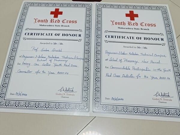 Anjuman-I-Islam Kalsekar Technical Campus has received an excellence award trophy and certificate from the Indian Red Cross Society and three of our YRC students Qureshi Mohammad Kaif Nasir, Shah Sarfaraz Ahmed, and Shaikh Mohammad Ilhan Imran got the best volunteer certificate from the Indian Red Cross Society at the annual prize distribution function of the Indian Red Cross Society held on 24th February 2024 at Padmashri Homi J.H. Taleyarkhan Memorial Hall, Indian Red Cross Society Building, Fort, Mumbai.