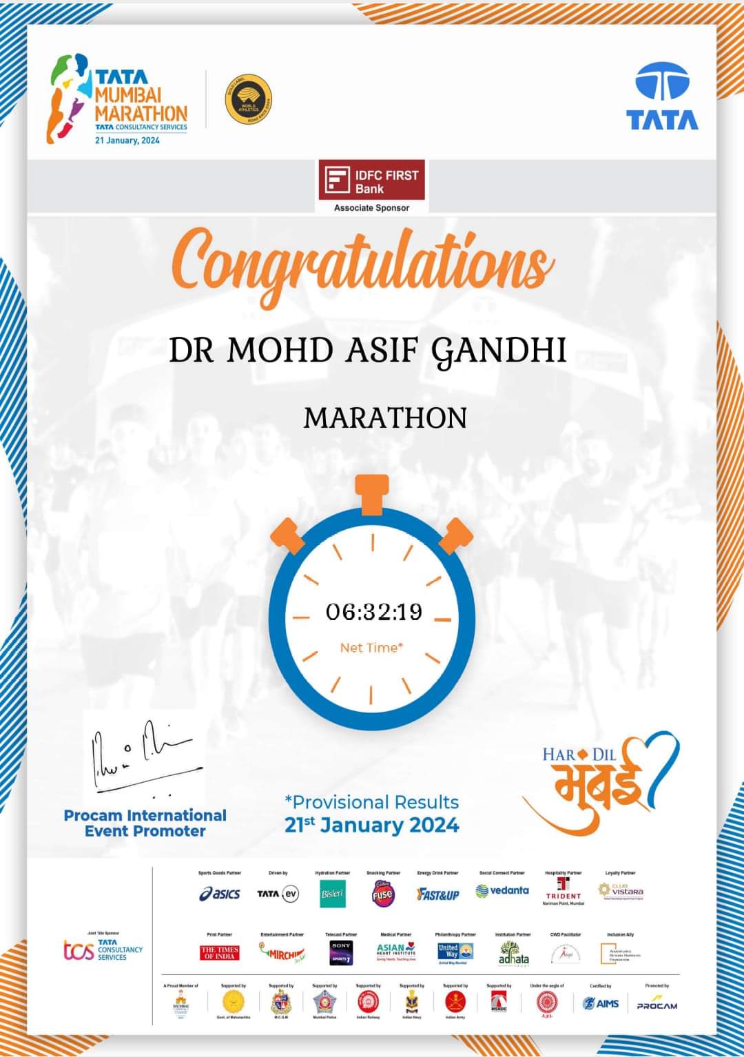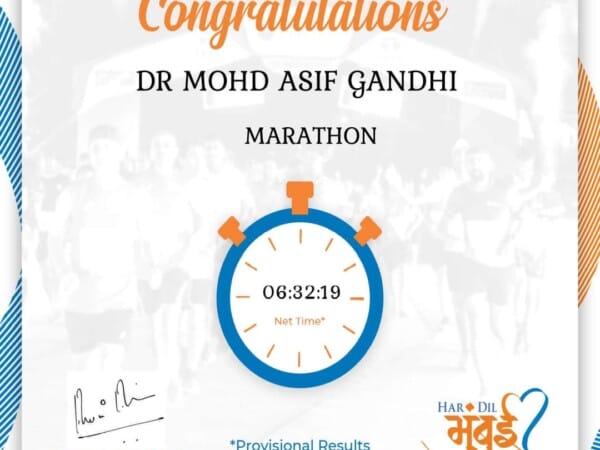 Dr. Mohd. Asif Gandhi (Associate Professor, Dept. of Mechanical Engg., AIKTC) dared to turn up at the start line of a Full Marathon again. Done and dusted with running his 11th Full Marathon (42.195 km run) apart from several Half Marathons and 10 km runs, open water sea swims, aquathlons, duathlons and triathlons in his 11 years of recreational, fitness and endurance sports journey so far (2014 to 2024) (from age 40 to age 51) at the recently concluded (21st January, 2024) 19th edition of the Mumbai Marathon, this time called as the Tata Mumbai Marathon 2024 (TMM-2024) for sponsorship reasons. He completed the 42.195 km run in 6 hrs, 32 min and 19 seconds.