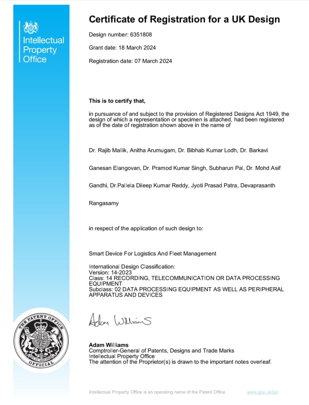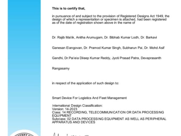 Dr. Mohd. Asif Gandhi’s U.K. Design Patent – Smart Device for Logistics and Fleet Management granted