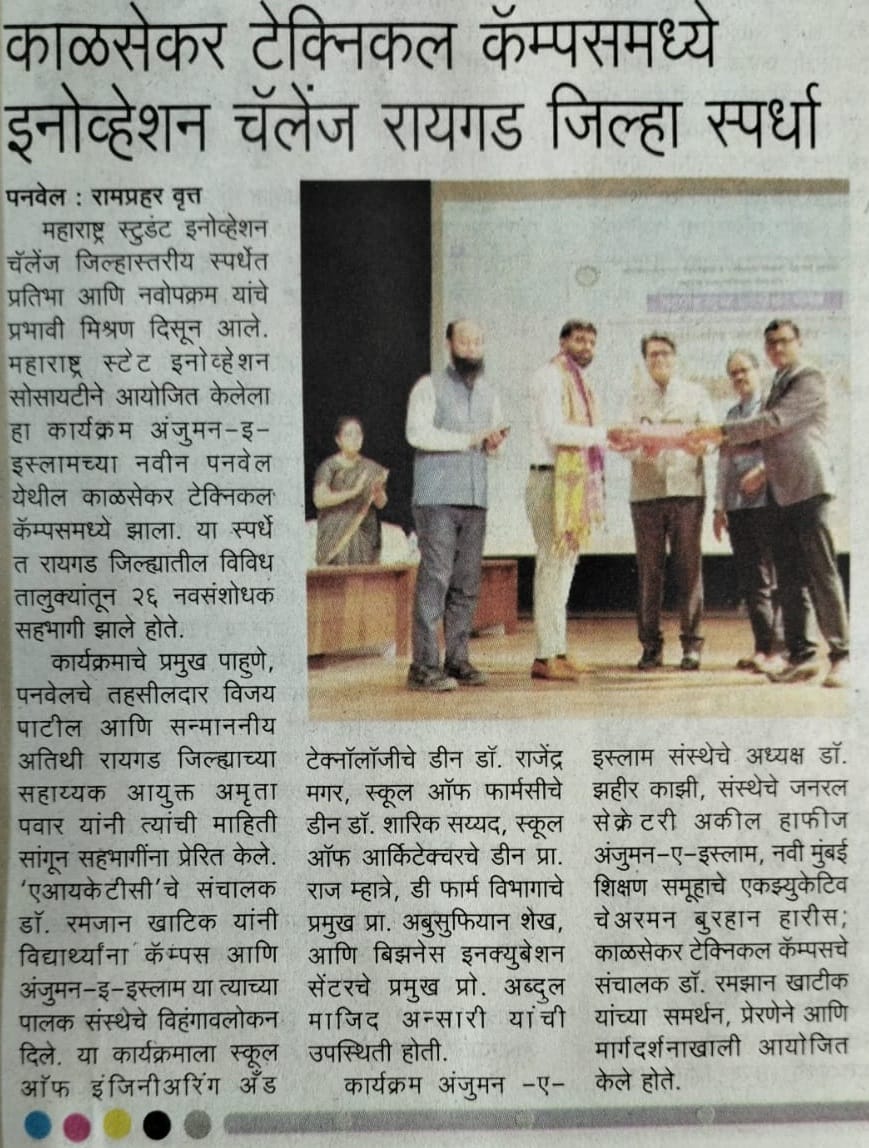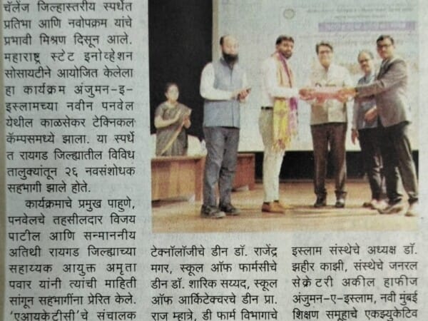 The Maharashtra Student Innovation Challenge district-level competition showcased an impressive mix of talent and innovation. Organized by the Maharashtra State Innovation Society, the event took place at the Kalsekar Technical Campus of Anjuman-I-Islam in New Panvel. Twenty-six innovators from various talukas of Raigad district participated in the competition.
