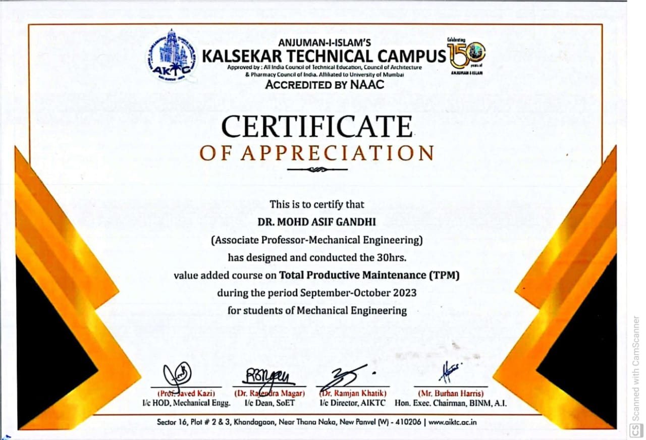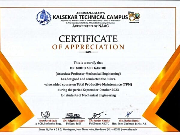 Dr. Mohd. Asif Gandhi, Associate Professor in Mechanical Engineering Department of the School of Engineering and Technology at Anjuman-I-Islam’s Kalsekar Technical Campus designed and conducted a 30 hrs Value Added Course (VAC) on Total Productive Maintenance (TPM) during September and October 2023 for students of 3rd year and 4th year of Mechanical Engineering. A total of 116 students benefitted from the course in TPM which is currently being used in the steel industry to a large extent. Dr. Mohd. Asif Gandhi has got 26 years of experience (10 years of industry experience and 16 years of experience in academia).